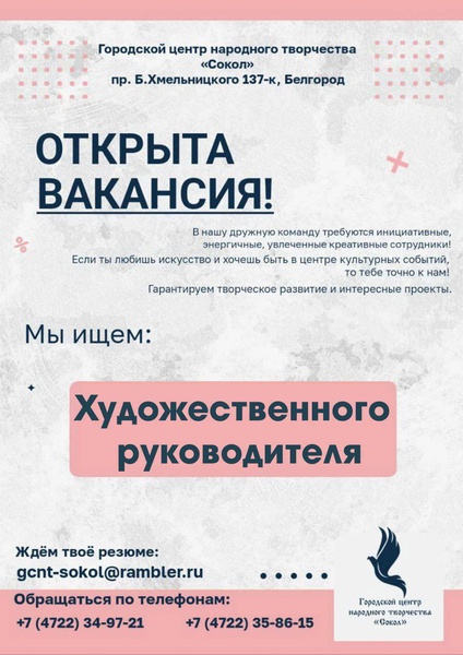 В команду ГЦНТ «Сокол» требуется художественный руководитель!