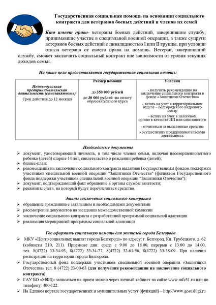 Социальный контракт — это форма государственной поддержки, направленная на улучшение качества жизни, помощь в трудоустройстве, обучении, открытии собственного дела и решении других важных вопросов. Подробности и условия получения социальной помощи смотрите на изображении.